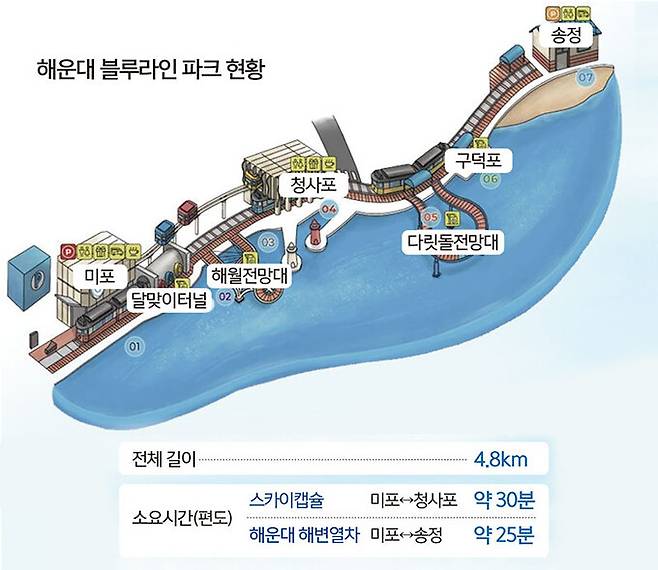 해운대 해변열차가 지나는 미포에서 송정까지 4.8㎞ 구간은 바다와 숲, 논밭 등 날것 그대로의 다양한 자연경관을 즐길 수 있는 점이 매력으로 꼽힌다. 부산의 관광명소를 편리하게 이동할 수 있는 교통수단 역할도 한다. 총 7개의 정거장에는 각각 다른 볼거리가 있어 어느 정거장에서 출발하고 도착하느냐에 따라 다양한 코스를 짤 수 있다.