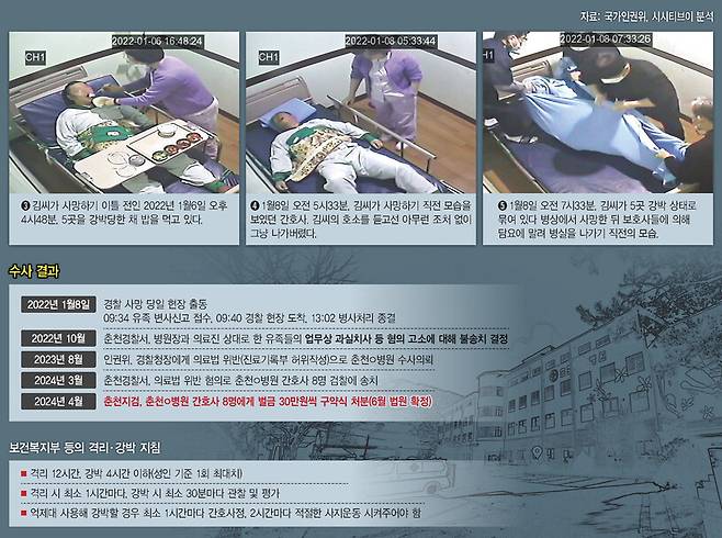 *편집자: 손과 발, 가슴을 단단히 묶는다. 환자는 마치 십자가에 못 박힌 것처럼 침대에 결박되어 누워 있다. 299개 병상을 갖춘 작은 정신병원인 춘천ㅇ병원에서 환자는 구원받지 못했다. 한겨레가 입수한 시시티브이 영상에서 환자는 매일 신음하고 괴로워하며 몸부림치다 서서히 죽어갔다. 의사도, 간호사도, 보호사도 적절한 구호조처를 외면했다. 영상 속에 등장하는 모든 인물들이 그 죽음의 동조자인 것처럼 보인다.