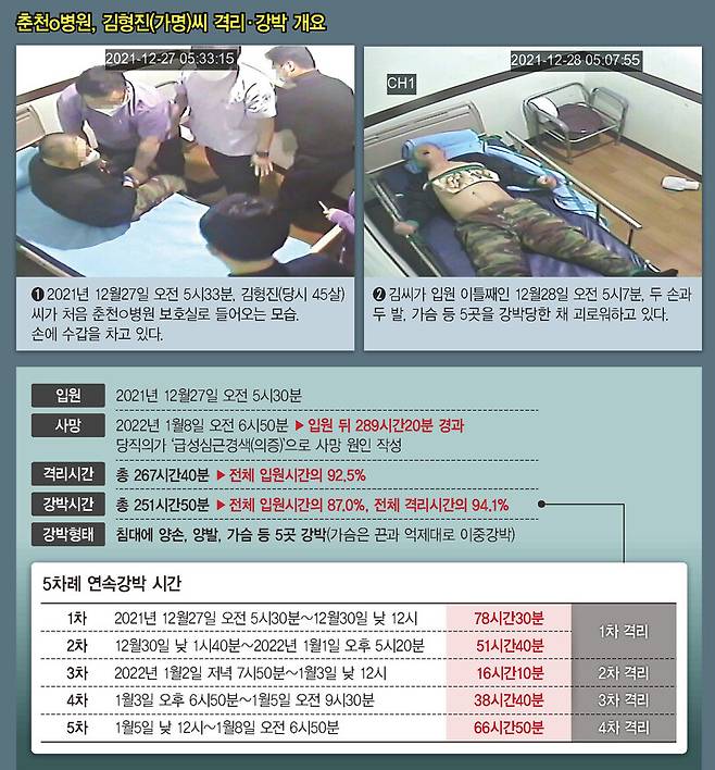 김형진(가명·45)씨는 호흡이 정지된 상태에서도 양손과 양발이 묶인 채 심폐소생술을 받아야 했다. 그나마 가슴 억제대가 풀린 게 다행이었다. 의사가 두 손으로 흉부를 압박하는 동안 간호사와 보호사가 발에 묶인 끈을 풀려고 다급히 움직였지만 쉽지 않았다. 팔다리의 강박을 푸는 데만 12분이 소요될 정도였다. 한겨레가 확보한 춘천ㅇ병원의 폐회로텔레비전(CCTV) 영상에는 규정을 위반해 수십시간 환자를 강박한 의료진의 모습이 고스란히 찍혀 있었다.