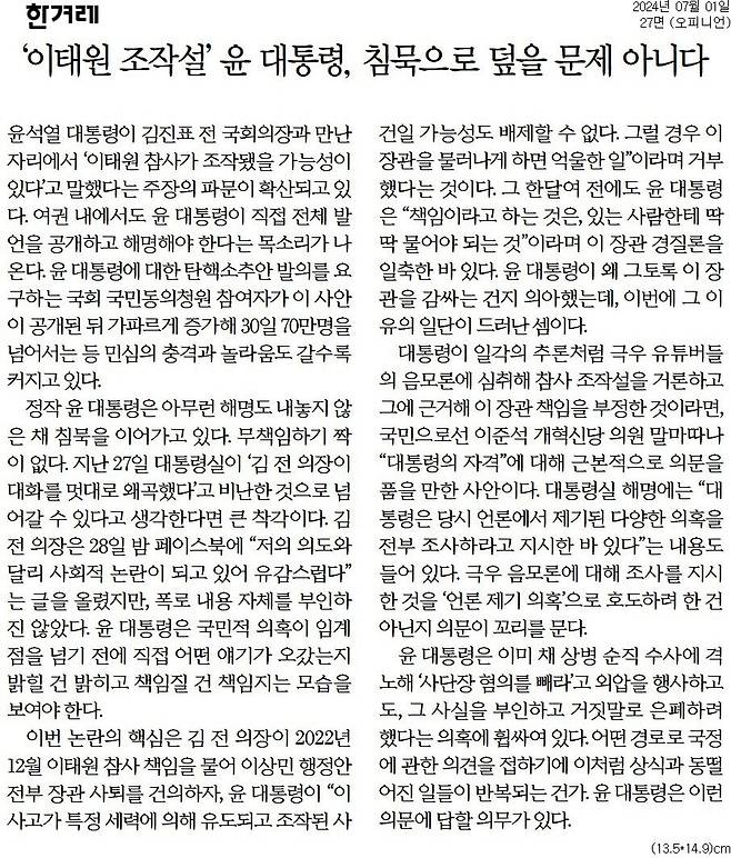 한겨레 = ‘이태원 조작설’ 윤 대통령, 침묵으로 덮을 문제 아니다