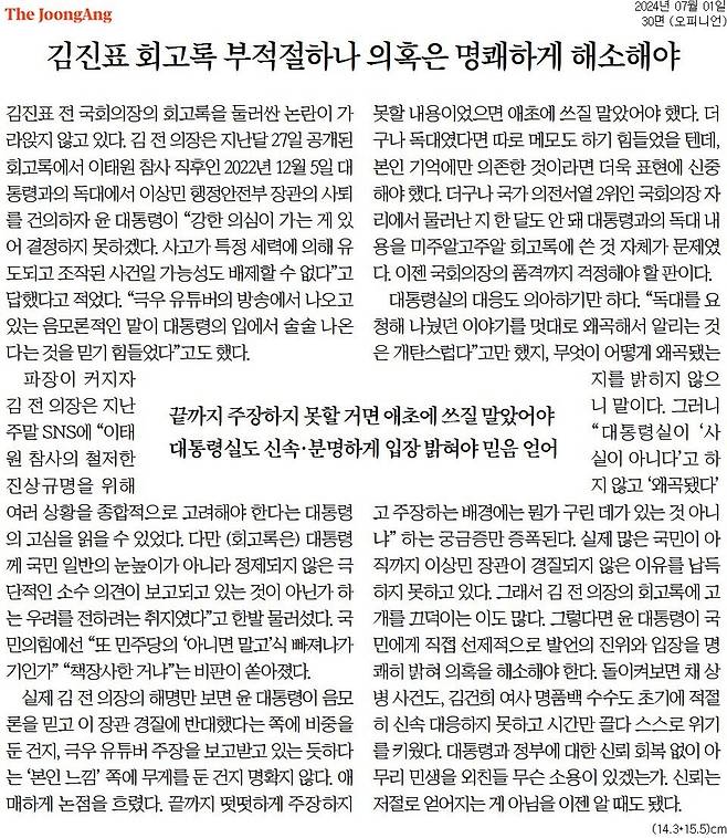 중앙 = 김진표 회고록 부적절하나 의혹은 명쾌하게 해소해야