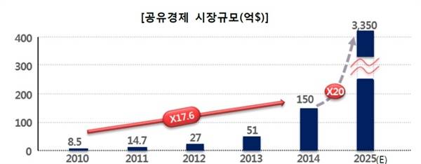| ▲ 공유경제 시장 규모를 보여주는 그래프. 조산구의 <공유경제2.0>에서는 “공유 경제 스타트업 창업은 2010년부터 2013년까지 매년 50퍼센트 가까이 증가했다”고 밝혔다. |