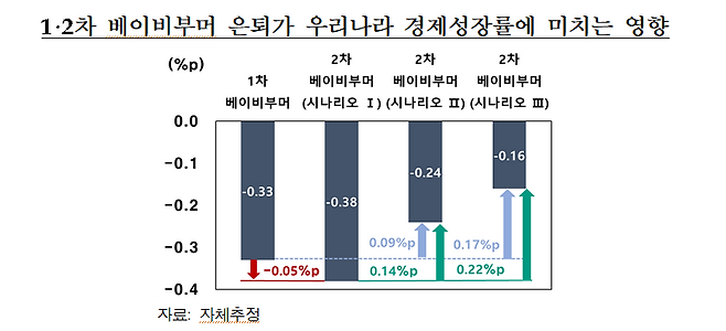이 경우 2차 베이비부머의 은퇴는 2024~2034년 중 연간 경제성장률을 0.38%p 하락시키는 것으로 추정됐습니다. 1차 베이비부머 은퇴에 따른 경제성장률 하락 폭보다 0.05%p 큰 건데, 이는 2차 베이비부머 세대의 은퇴 규모가 1차에 비해 큰 데 따른 영향으로 분석됩니다.