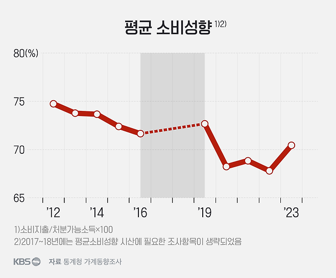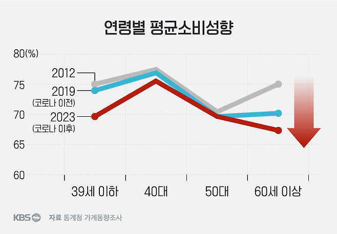 2012~2023년 중 60세 이상의 소비성향 하락폭은 75.0%에서 67.1%로 나타났습니다. 전체 연령 소비성향 하락 폭(74.7%→70.7%)보다 컸는데요.