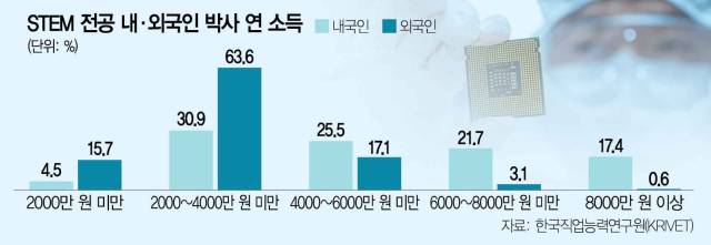 한국직업능력연구원에 따르면 이공계(STEM) 분야를 전공한 외국인 박사 중 4000만 원 미만의 연봉을 받는 비율은 79.3%에 이른다.