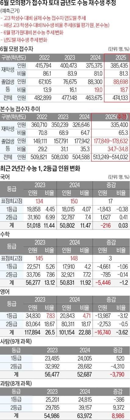 종로학원에서 최근 고3 학생 수 대비 실제 수능 접수자 비율, 최근 6월 평가원 모의고사 때 N수생 규모, 매년 고교 졸업생 대비 N수생 비율 등 최근 추세를 종합해볼 때, 2025학년도 대입 N수생은 17만7800명대에서 17만8600명대로 추정되는 결과가 나왔다. 지난해 17만7942명과 비슷한 수준이다. 그러나 올해 고교 졸업생이 지난해보다 3만6000명 줄어드는 상황에서 N수생도 줄어야 하는데 비슷한 수치가 나온 것은 재수생보다 삼수생 이상의 수능 준비생이 늘어날 것으로도 추정된다.