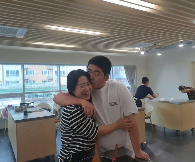 | ▲ 범준은 엄마 볼에 입 맞추고 있다. 범준 엄마는 현재 ‘장애이해교육강사’로 일하고 있다. |