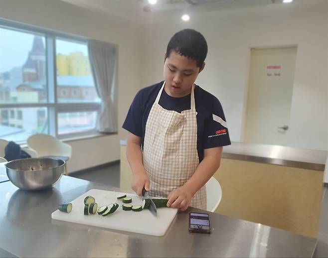 지난 6월 30일 발달장애 아동들이 제주시에 위치한 공유주방에 모였다. 원준, 범준, 도준, 주원, 대현, 그리고 이들의 엄마들. 오늘은 돼지불고기와 오이냉국을 요리할 예정이다.