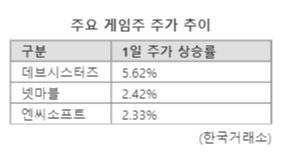 코스피시장에서는 엔씨소프트가 전장 대비 2.33% 오른 18만4100원을 기록했다. 넷마블은 2.42% 오른 5만5000원에 거래를 마쳤다.