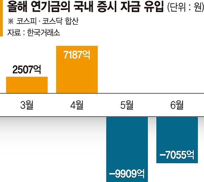 1일 한국거래소에 따르면 연기금은 6월 한 달 간 코스피·코스닥시장에서 총 7055억원을 순매도했다. 같은 기간 기관 전체가 순매도한 금액(2조5183억원)의 28% 수준으로, 기관계 가운데 순매수 1위다. 특히 지난달 17일 이후 28일까지 10거래일 연속 매도 우위를 보였다. 이 기간 팔아치운 금액은 5822억원에 이른다.