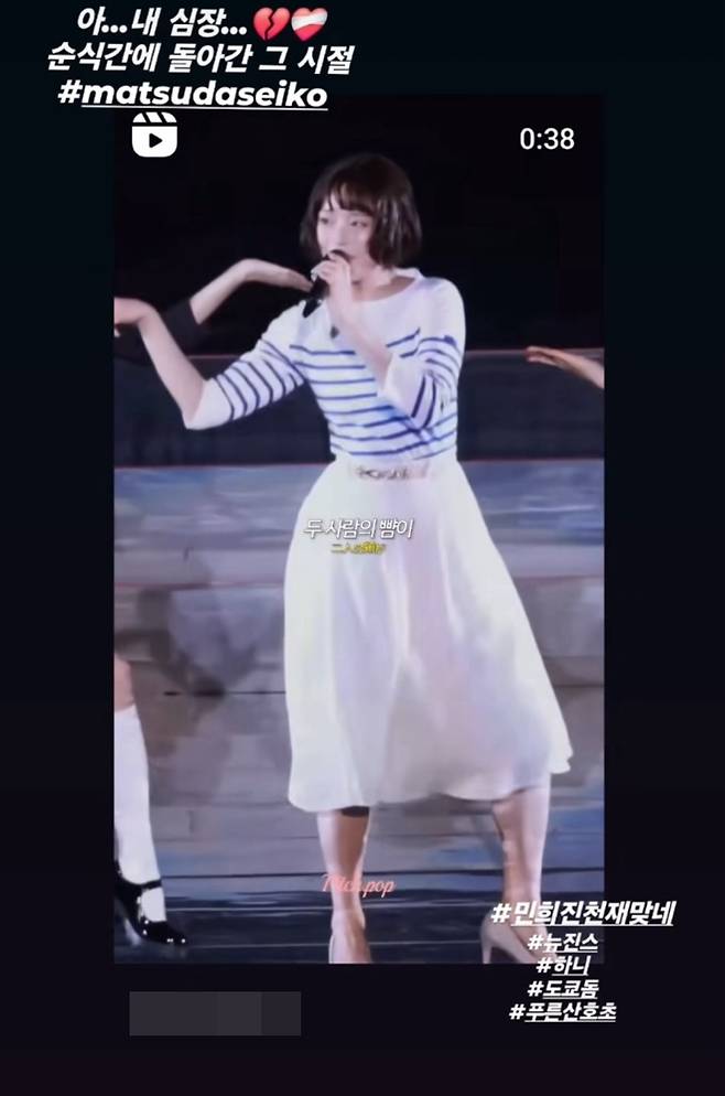 영상에는 뉴진스 하니가 최근 도쿄돔에서 열린 팬미팅에서 '푸른 산호초' 솔로 무대를 꾸민 모습이 담겼다. 이날 다섯 멤버들을 각기 다른 매력을 담은 솔로 무대를 펼쳤고, 그중 하니의 '푸른 산호초' 무대가 현지 팬들의 폭발적인 반응을 얻었다.