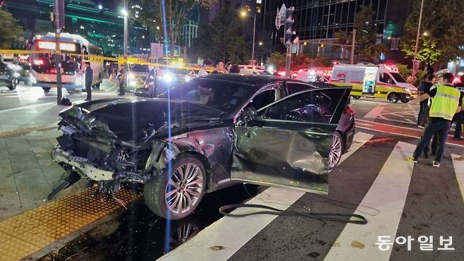 | 심하게 파손된 가해차량 1일 서울 중구 시청역 인근 도로에서 역주행 사고를 낸 가해자가 몰던 제네시스 G80. 운전석과 뒷좌석 문이 심하게 파손됐다. 주현우 기자 woojoo@donga.com |