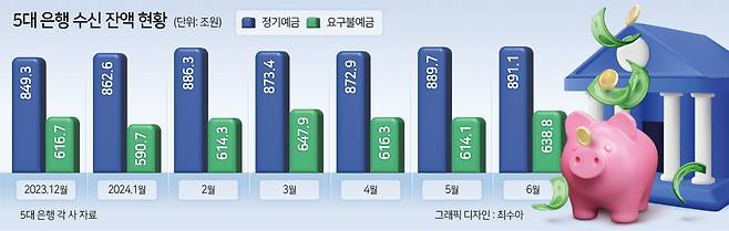 2일 금융권에 따르면 지난달 말 기준 5대 시중은행(KB국민·신한·하나·우리·NH농협)의 수시입출금식 저축성예금(MMDA)을 포함한 요구불예금 잔액은 638조8317억원으로 전월 말(614조1055억원)과 비교해 24조7262억원(4.02%)가량 대폭 늘어난 것으로 나타났다.