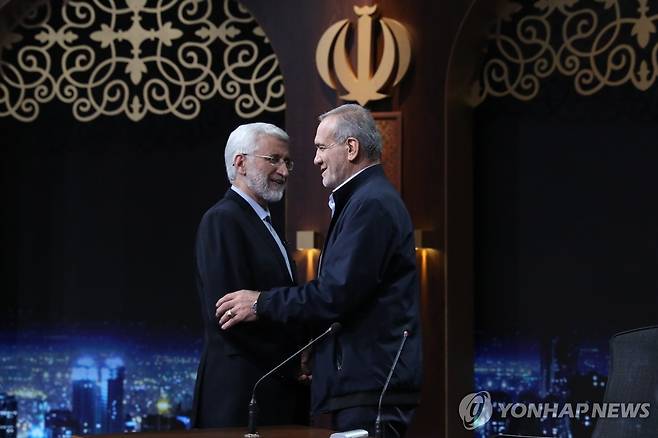 (테헤란 EPA=연합뉴스) 1일(현지시간) 이란 테헤란의 국영 IRIB 방송 스튜디오에서 열린 대선 후보 TV 토론에 참석한 사이드 잘릴리 후보(왼쪽)와 마수드 페제시키안 후보가 인사하고 있다. 지난달 28일 치러진 1차 투표에서 득표율 1~2위를 기록한 이들은 오는 5일로 예정된 결선 투표에서 맞붙는다. [IRIB 제공] 2024.07.02