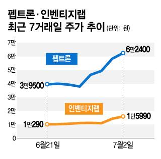 2일 펩트론과 인벤티지랩의 주가는 각각 6만2400원, 1만5990원으로 장을 마감했다. 최근 7거래일 동안 58.0%, 55.4%씩 급등한 수치다. 특히 펩트론은 최근 연이은 급등에 이날 장중 52주 신고가(6만4500원)을 경신했다.