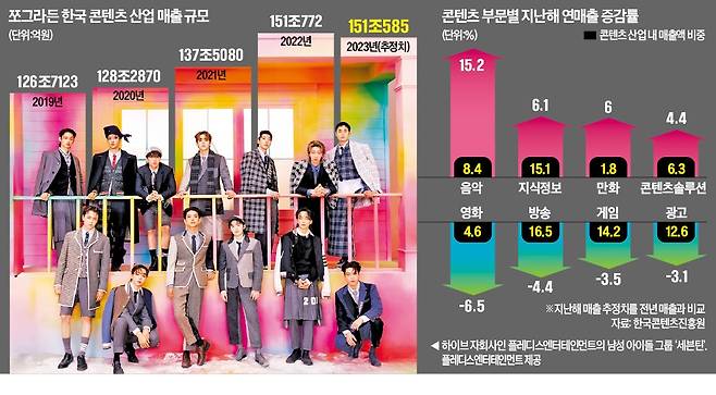 연간 151조원 규모에 달하는 한국 콘텐츠시장의 성장동력이 바뀌었다. K팝을 앞세운 음악시장 매출 규모가 지난해에만 15% 넘게 커졌다. 남성 아이돌 그룹을 뜻하는 ‘남돌’ 두 팀이 지난해에만 1000만 장 넘는 앨범을 판매하며 K팝시장을 키웠다. 한류 1세대로 불리는 게임, 방송 등의 매출이 줄어든 가운데 낸 성과다.