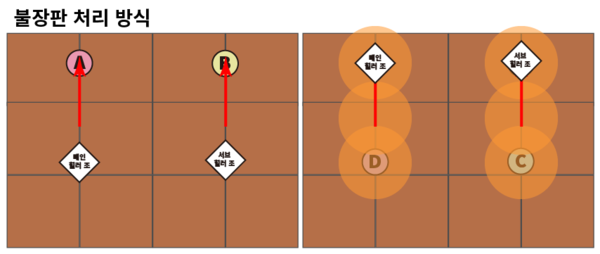 1. A와 B 마커 중 가장 앞줄의 마법진이 생성되지 않은 쪽이 안전지대