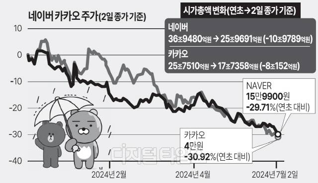 카카오 주가는 4만원으로 같은 기간 30.2% 내렸다. 시가총액도 연초 25조7510억원에서 17조7358억원으로 8조원 넘게 빠졌다.