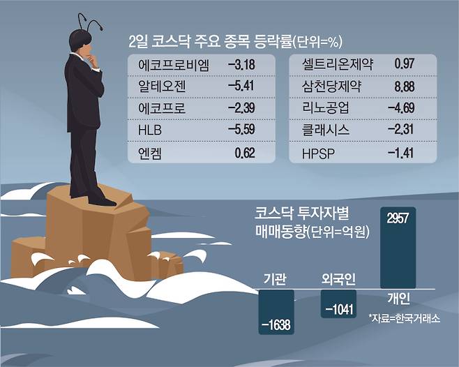 특히 기관은 주가가 급락한 이노스페이스(562억원)와 알테오젠(146억원)을 가장 많이 팔아치웠다. 에코프로(126억원)와 HLB(113억원) 등은 외국인 순매도 종목 상위권에 올랐다.