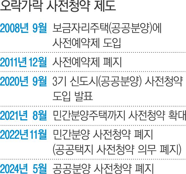 민간 사전청약이 도입된 것은 문재인 정부 때인 2021년 8월이다. 처음에는 3기 신도시에 지어지는 공공분양 아파트에 대해서만 사전청약을 했는데, 당시 정부는 이 정도 물량으로는 청약 수요를 잠재우기 어렵다고 보고 민간분양으로 확대했다. 사전청약을 6개월 내 진행한다는 조건으로 공공택지를 싸게 분양한 것이다.
