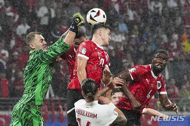 [라이프치히=AP/뉴시스] 튀르키예(42위) 골키퍼 메르트 귀노크(왼쪽)가 2일(현지시각) 독일 라이프치히 스타디움에서 열린 유로 2024 16강전 오스트리아(25위)와 경기 중 공을 쳐 내고 있다. 튀르키예는 데미랄의 멀티 골에 힘입어 오스트리아를 2-1로 꺾고 16년 만에 8강에 진출해 네덜란드(7위)와 4강 진출을 다툰다. 2024.07.03.