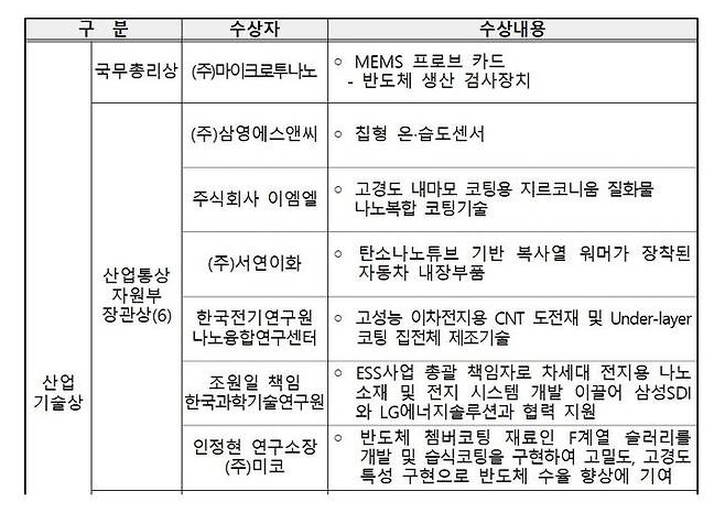 [세종=뉴시스]이승주 기자 = 반도체 검사장치인 프로브카드 전문기업 마이크로투나노가 산업기술 부문에서 국무총리상을 받았다. 나노촉매를 속도론적으로 해석해 실내 조리흄 정화기술을 개발한 김우열 한국에너지공과대 교수는 연구혁신 부문에서 수상했다.
