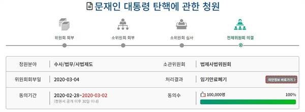 | ▲ 2020년 국회 국민동의청원에 올라온 문재인 대통령 탄핵에 관한 청원 |