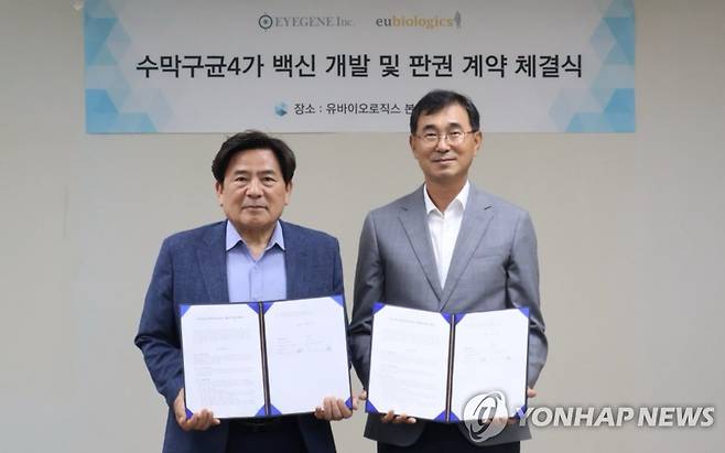 (서울=연합뉴스) 백영옥 유바이오로직스 대표(왼쪽)가 3일 서울 강남구 유바이오로직스에서 열린 수막구균4가 백신 개발 및 판권 계약 체결식에서 최석근 아이진 대표와 기념 촬영하고 있다. 2024.7.3 [유바이오로직스 제공. 재판매 및 DB 금지]