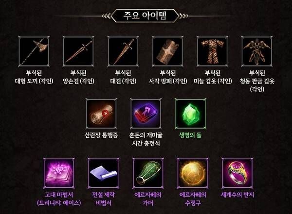 이 던전에서는 부식된 무기 및 방어구 시리즈를 비롯해 고대 마법서(트리니티: 에이스), 세계수의 반지, 전설 제작 비법서 등 다양한 보상이 나온다. 최상위 유저들과 혈맹들의 경쟁이 한층 치열해질 전망이다.
