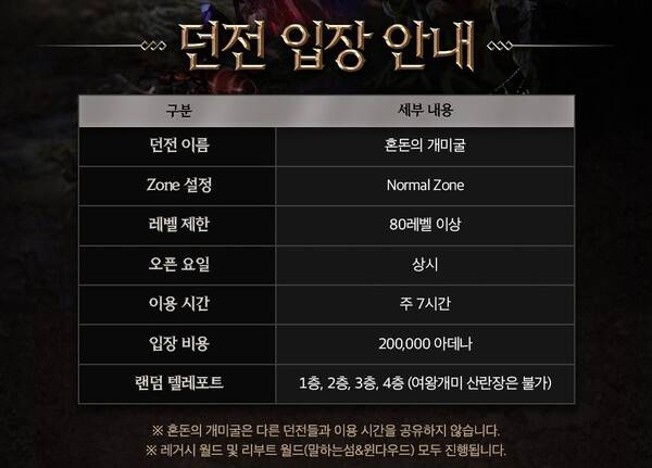 던전 입장 조건은 80레벨 이상이다. 상시 오픈이지만 주마다 7시간만 이용할 수 있으며 20만 아데나를 내야 입장 가능하다. 이 때 혼돈의 개미굴은 다른 던전들과 이용 시간을 공유하지 않는다.