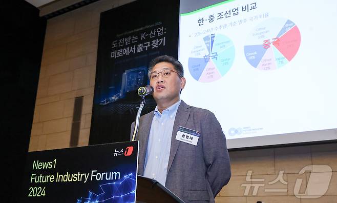 (서울=뉴스1) 김성진 기자 = 성영재 HD한국조선해양 탈탄소선박연구랩 부문장이 3일 서울 중구 대한상공회의소 의원회의실에서 열린 '뉴스1 미래산업포럼(NFIF) 2024'에서 고부가가치 선박 수주와 기술 경쟁력 대해 발표하고 있다. 2024.7.3/뉴스1