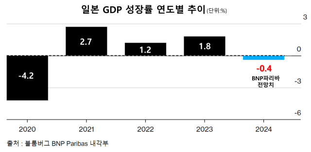 3일 블룸버그통신에 따르면 BNP파리바와 SMBC닛코증권은 지난 2일 보고서에서 일본의 올해 경제 성장 전망을 대폭 낮추며 2024년 GDP 성장률이 2020년 팬데믹 이후 마이너스를 기록할 것으로 전망했다. BNP파리바는 0.4% 역성장을, SMBC는 0.3% 감소를 예상했다. 두 증권사는 이전 보고서에서 모두 소폭 성장을 전망한 바 있다.