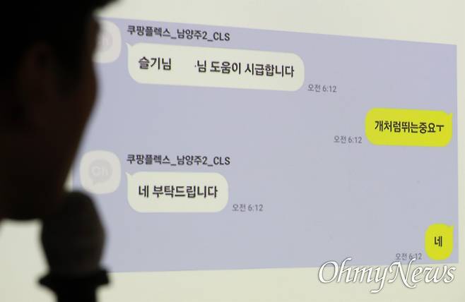 택배과로사대책위 주최로 3일 오후 서울 서대문구 서비스연맹에서 열린 쿠팡 로켓배송 택배노동자의 과로사 관련 '41세 쿠팡 로켓배송 택배노동자의 과로사, 쿠팡의 책임이다! 기자간담회'에서 과로사 한 고 정슬기씨의 부친인 정금석씨가 자리에 앉고 있다. 왼쪽 위로 고인이 된 아들이 일하며 쿠팡플렉스_남양주2_CLS와 주고받았던 메시지가 보여지고 있다.