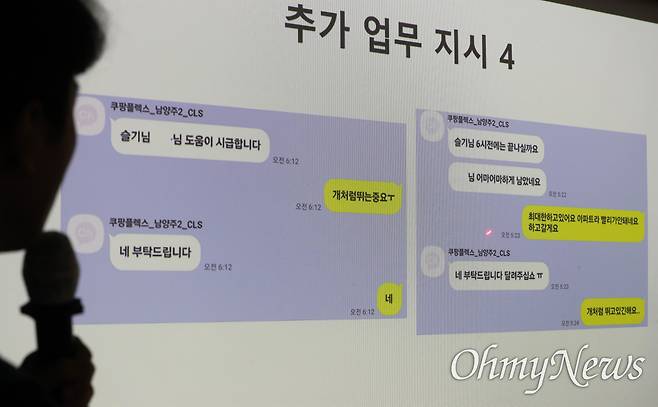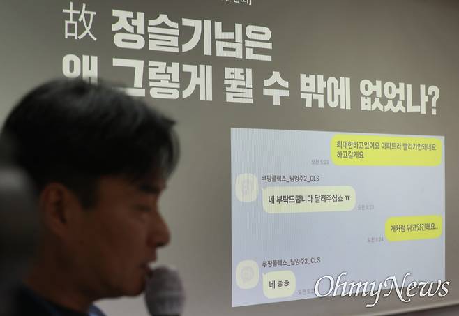 택배과로사대책위와 택배노조 쿠팡본부 준비위, 유족 등 기자간담회 참석자들은 '쿠팡CLS 카카오톡 업무지시를 통해 본 실제 업무관계와 고 정슬기님은 왜 그렇게 뛸 수밖에 없었나?' 등을 설명하고 "결국 고인의 과로사의 원인이 된 쿠팡의 배송시스템은 장시간 노동을 강요하는 것이며 이는 사회적 합의와 생활물류법을 교란하고 있다"며 강력한 감독의 필요성과 재발 방지를 강조했다.