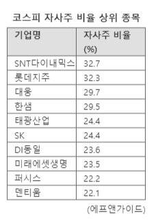 코스피 시가총액 5000억원 이상 기업 가운데 자사주 비율 상위 종목을 보면 SNT다이내믹스가 32.7%로 가장 높다. 이어 롯데지주(32.3%), 대웅(29.7%), 한샘(29.5%), 태광산업(24.4%) 순으로 나타났다. SK의 자사주 비율도 24.4%에 달했다.