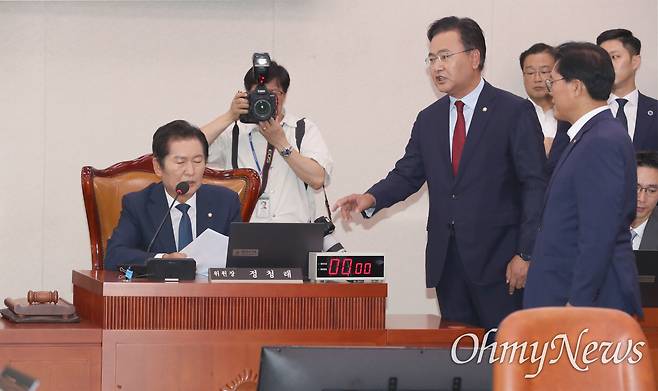| ▲ 국민의힘 유상범 의원과 송석준 의원이 25일 오전 서울 여의도 국회에서 열린 법제사법위원회 전체회의에서 정청래 위원장에게 의사진행에 대해 항의하고 있다. |