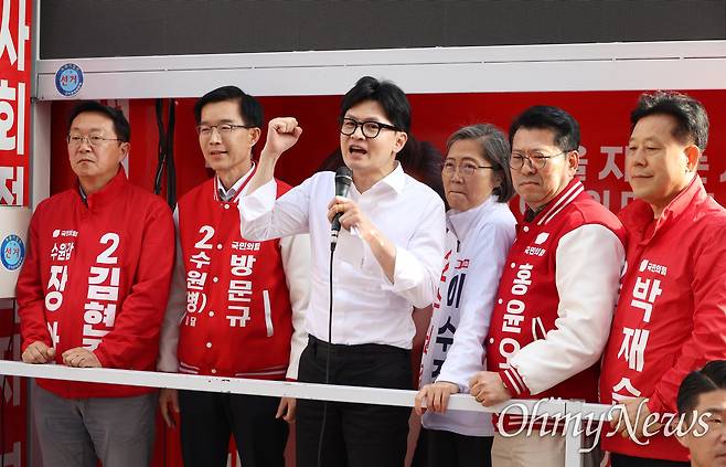 | ▲ 국민의힘 한동훈 비대위원장이 4월 4일 오후 경기도 수원시 영통구청 부근에서 22대 총선 수원시정 이수정 후보 등 수원지역 후보 지원유세를 하고 있다. |