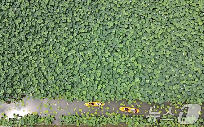 (부여=뉴스1) 김기태 기자 = 3일 충남 부여 서동공원(궁남지)에서 진행되는 부여서동연꽃축제에서 관광객들이 카누 체험을 즐기고 있다.