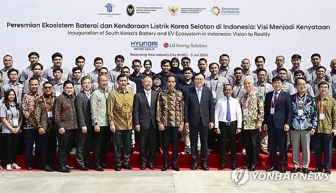 (서울=연합뉴스) 정의선 현대차그룹 회장, 조코 위도도 인도네시아 대통령이 3일(현지시간) 인도네시아 서자바주 카라왕 신산업단지에 세운 배터리셀 합작공장 HLI그린파워 준공식에서 주요 기념 촬영하고 있다. 2024.7.3 [현대차·기아 제공. 재판매 및 DB 금지]