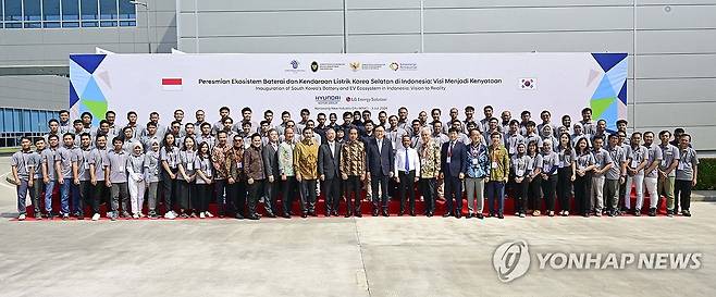(서울=연합뉴스) 정의선 현대차그룹 회장, 조코 위도도 인도네시아 대통령이 3일(현지시간) 인도네시아 서자바주 카라왕 신산업단지에 세운 배터리셀 합작공장 HLI그린파워 준공식에서 주요 기념 촬영하고 있다. 2024.7.3 [현대차·기아 제공. 재판매 및 DB 금지]