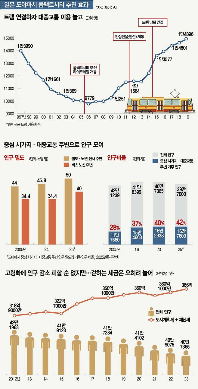 도야마가 유명한 또 다른 이유는 일본 ‘콤팩트시티(Compact City·압축도시)’의 롤모델 격이기 때문이다. 콤팩트시티는 도시 중심부에 거주·상업·행정 등 각종 도시 기능을 집약해 고밀개발하고 효율을 높이는 도시계획이다. 1973년 미국에서 처음 발표된 개념. 자가용 대중화로 시가지가 팽창하면서 발생하는 난개발, 생산성 저하 같은 문제를 해결하고 경제성을 높이는 대안으로 꼽힌다. 우리보다 먼저 인구 고령화를 경험한 일본은 10여년 전부터 ‘압축+네트워크형’ 도시 정책을 본격화했다. 일찌감치 콤팩트시티를 추진해온 도야마시가 대표 사례다.