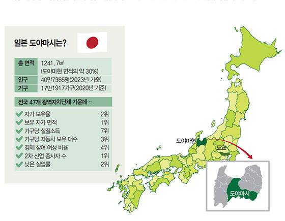 이제 도야마는 일본 전국 47개 도도부현(광역자치단체) 가운데 가구당 자가 보유율 2위, 가구당 실질소득 7위, 2차 산업 종사자 수 1위일 뿐 아니라 초·중학교 전국학력평가에서도 수위를 달린다. 일본 정부와 민간 평가에서 행복지수 높은 최상위권 도시로 꾸준히 이름을 올린다. 경제협력개발기구(OECD)는 2012년 도야마시를 멜버른(호주), 밴쿠버(캐나다), 파리(프랑스), 포틀랜드(미국)와 함께 ‘콤팩트시티 세계 선진 5대 도시’로 꼽기도 했다. 인구 감소, 저출생은 전 세계가 직면한 과제인데 도야마시가 선제 대응을 했다는 점에서 좋은 평가를 받았다.