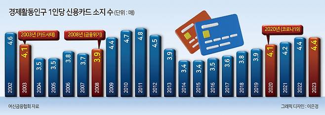 지금껏 1인당 신용카드 매수는 경기가 어려울 때마다 늘었다. 경제활동인구 1인당 신용카드 소지 수는 이른바 ‘카드사태’가 있었던 2002~2003년과 글로벌 금융위기 이후인 2009~2011년에 급증한 것으로 나타났다.