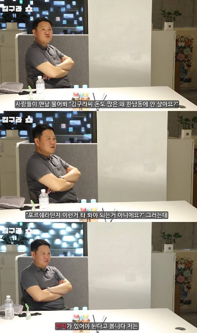 김구라는 "'김구라씨 돈도 많은데 왜 한남동 안 살아요?' 묻는 사람들이 있는데, 나는 돈이 아무리 많아도 안 간다. 그냥 외곽이 좋다"고 전했다.