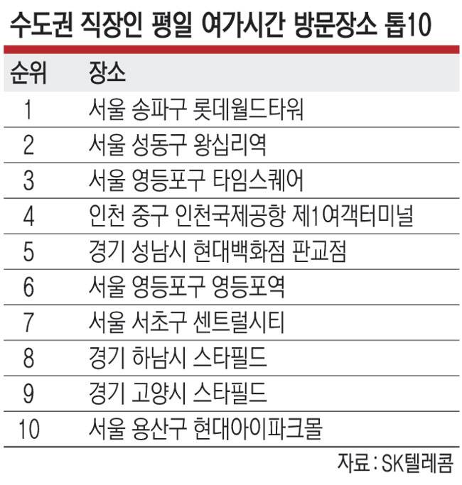 전체 연령대가 퇴근 후 가장 많이 찾는 곳은 복합 쇼핑몰로 집계됐다. 이어서 백화점, 대형마트, 시장 등 쇼핑을 하기 위한 장소를 많이 방문했다. 이 외에 병원이나 숙박시설, 공항, 영화관, 야구장, 체육관 등의 장소가 순위권에 올랐다.