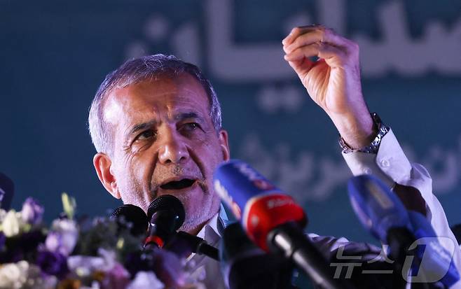 (테헤란 AFP=뉴스1) 우동명 기자 = 마수드 페제시키안 이란 개혁파 대선 후보가 3일 (현지시간) 결선 투표를 앞두고 테헤란의 경기장에서 유세를 하고 있다. 2024.07.04