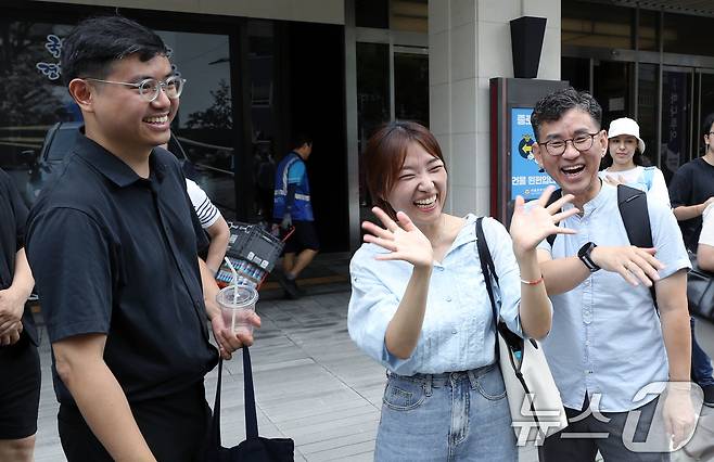 (서울=뉴스1) 박정호 기자 = 팔레스타인인들과 연대하는 사람들 박이랑(왼쪽부터), 김지윤, 최영준 활동가가 4일 오후 서울 종로구 공평동 종로경찰서 앞에서 팔레스타인 연대 활동가 3인 경찰 출석 요구 규탄 기자회견을 마친 뒤 출석에 앞서 다른 활동가 등과 인사를 나누고 있다.