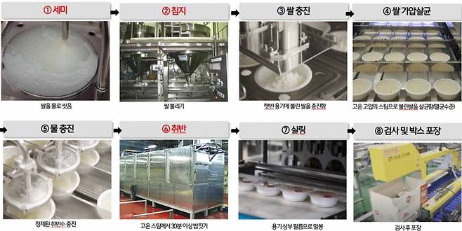 입고된 이후엔 CJ블로썸캠퍼스의 기술력이 적용된다. 도정(껍질을 벗겨내는 공정) 과정에서 5단계가 적용되는데 바람과 진동(무게), 석발(돌 걸러내는 과정), 두께선별, 색채선별 등으로 이물질을 걸러낸다. 이어 쌀을 씻는 '세미', 불리는 '침지', 용기에 담는 '충진' 과정을 마치면 '가압살균'을 시작으로 5단계의 본격적인 위생공정을 거치게 된다. 140도 이상의 온도에 8번 노출된 쌀은 살균(미생물을 제거하거나 수를 급격히 낮춤) 상태로 만들어진다.