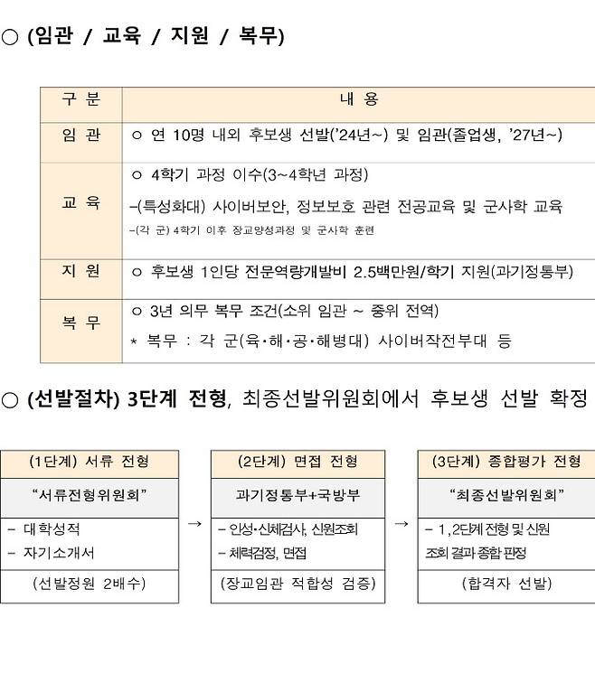 2024년 사이버전문사관 후보생 선발은 정보보호특성화대학인 고려대(세종), 성신여대, 세종대, 전남대, 충남대 등의 재학생들이 대상이다.