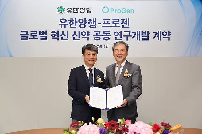 조욱제 유한양행 대표는 "포괄적 연구개발 협력 계약을 통해 프로젠과의 지속적인 기술 교류 및 협력을 이어 나갈 예정"이라며 "이를 바탕으로 글로벌 경쟁력이 있는 혁신 신약 파이프라인을 확보할 수 있는 계기가 되길 기대한다"고 밝혔습니다.